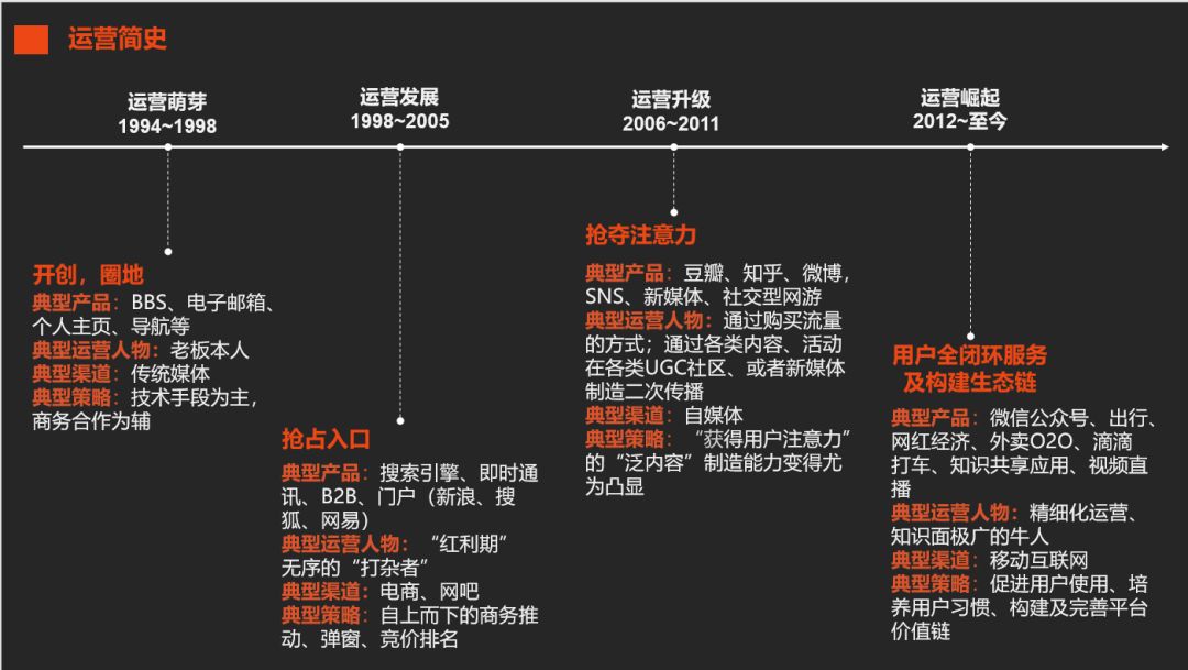 有这么一句话:“历史总是惊人的相似,但不是简单的重复”。很多事情在发展的过程中的规律、方向、原理可能都很相像,知道它的过去方能掌握它的未来。我们向前追溯了20多年互联网典型产品的变迁,将运营大致分为4个阶段——运营萌芽、运营发展、运营升级以及运营崛起。