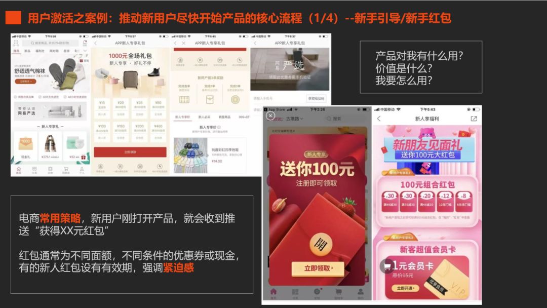 对于电商,常常提供分享红包、免费或者限时的VIP服务还有专项特价商品等,让用户有种“有利可图”的感知,降低新用户消费门槛的同时也用服务和权益黏连用户,加快了新用户向付费用户和深度用户转化的进程。