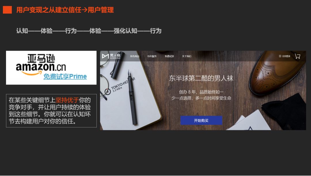 用户变现的阶段核心是转化用户进行交易,而交易的基础是供求关系。用户是否与产品平台发生交易关系,首先看是否需要这件东西,其次是否信任这个平台。对于电商来讲,“信任”的因素真的很重要。