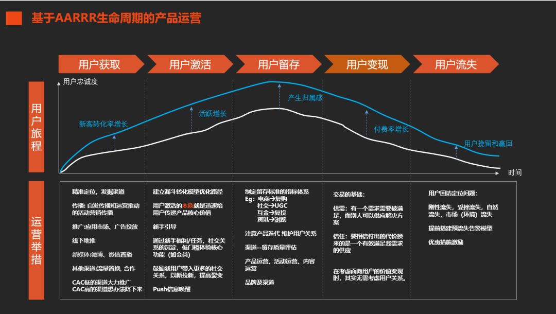而基于具体的场景,产品运营对技术有了更高更科技的需求,也不断地推进技术的进步。在《运营之光》的书中,对于运营有详细的定义——主要两个方面,第一是获取用户并且转化用户让其付费,第二是让用户长期与产品平台发生关系。那么就引入了“生命周期”的概念。