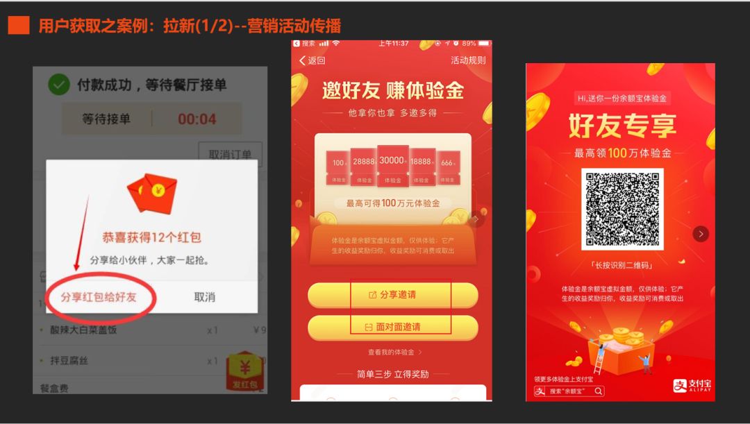 这里举了几个电商在用户获取的详细举措,例如红包刺激、营销活动,降低了用户的“付出门槛”。比如自媒体的软文传播,用标新立异的题目获得用户眼球,产生自传播,正是我们俗称的“标题党”来吸引一波种子用户。