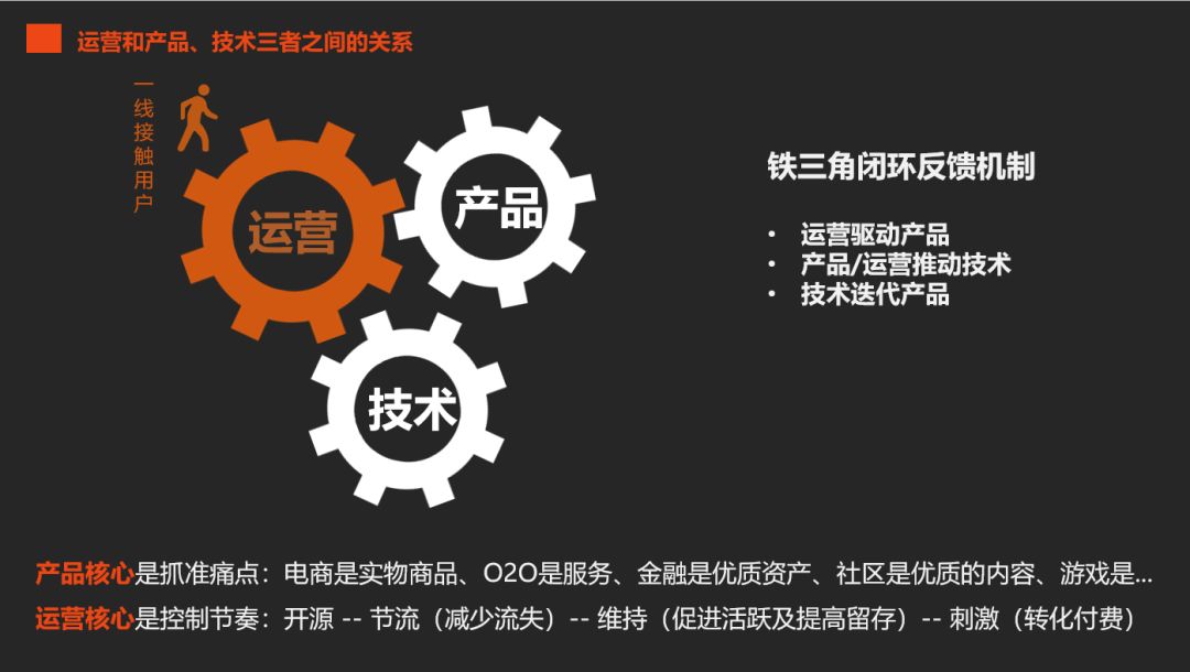 对于互联网企业而言,大致将其分为3大板块——产品、运营和技术,这三者是一种铁三角闭环反馈机制的职能。产品由0到1创造产品,解决了用户的核心痛点。运营基于产品一线接触用户,搜集用户的反馈将信息传递给产品进一步改进产品的设计。