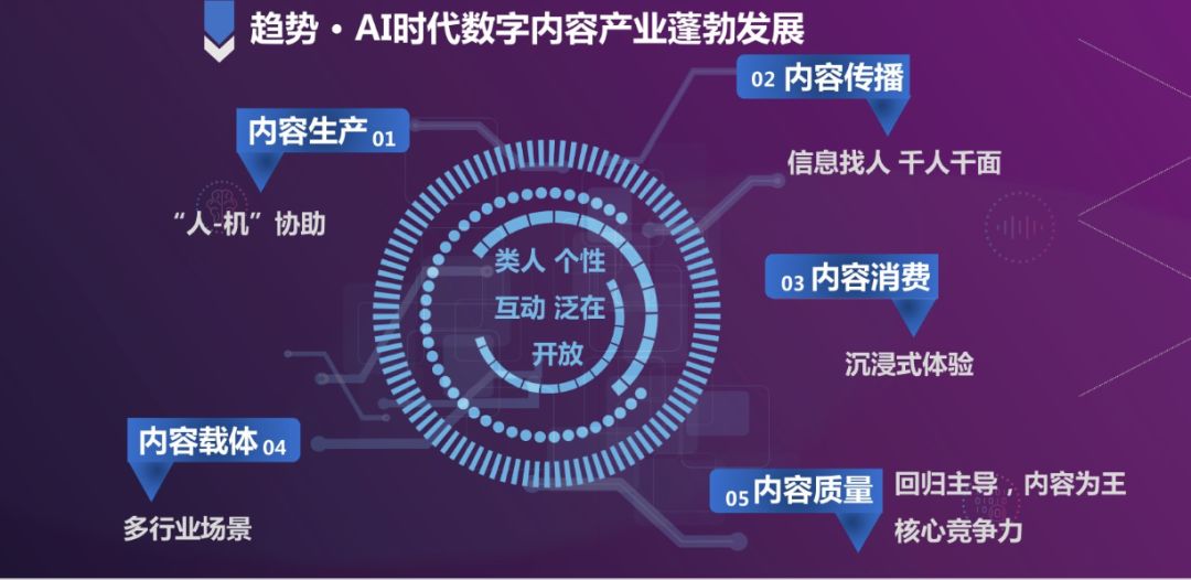 新技术普及应用将带来巨大的数据量和广泛的连接终端,人工智能保证了海量异构数据的高效和有效转化。万物互联、万物皆媒的未来,金融、家居、汽车、教育、医疗等各类场景均正在或将成为数字内容新的载体、传播渠道和信息终端。此外,人工智能在知识产权保护、数字营销、广告宣传等各领域均有应用,极大地拓展了数字内容的外延。