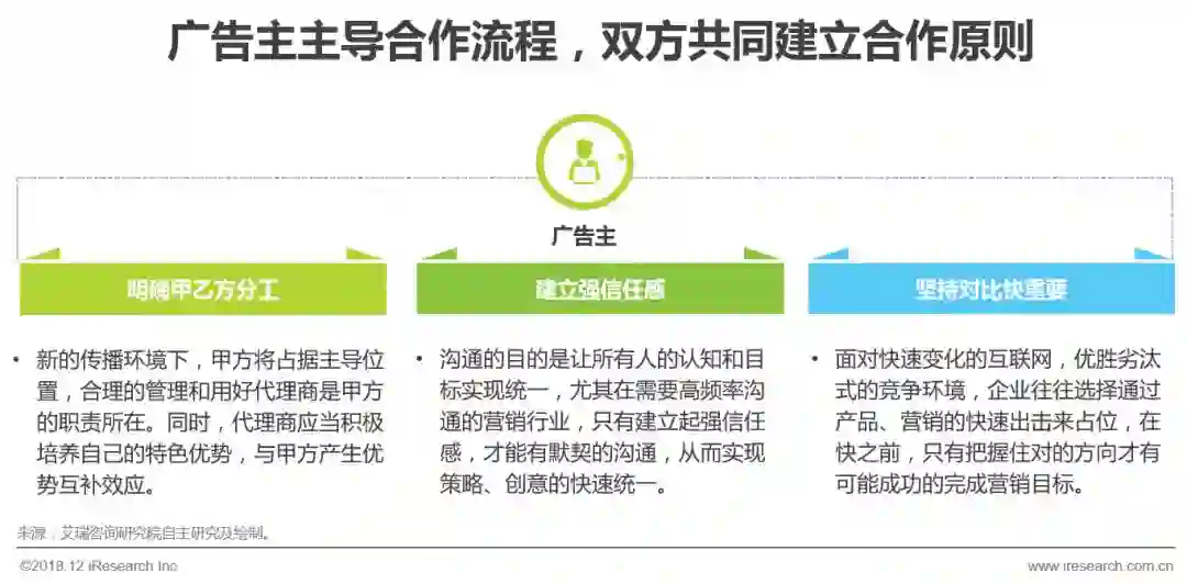 在过去的合作模式中,乙方全权代理甲方品牌业务并处于主导位置,双方的合作关系是乙方服务团队和甲方品牌部对接的过程。现在,随着传播环境的变化,营销工作的完成,不止聚焦于甲方品牌部,而是由甲方内部多部门的协同完成,并且协作变的越来越重要。与此同时,代理商面对着无法深入甲方内部和自身服务模式局限的问题,从而不能帮助甲方从根本上解决问题。因此,在新的传播环境下,甲乙方的合作模式,由代理商主导变为由甲方主导全流程营销工作,并在此基础上,明确甲乙方分工,建立强信任感来达成默契的沟通,同时,在快速变化的互联网当中,应坚持对比快重要。