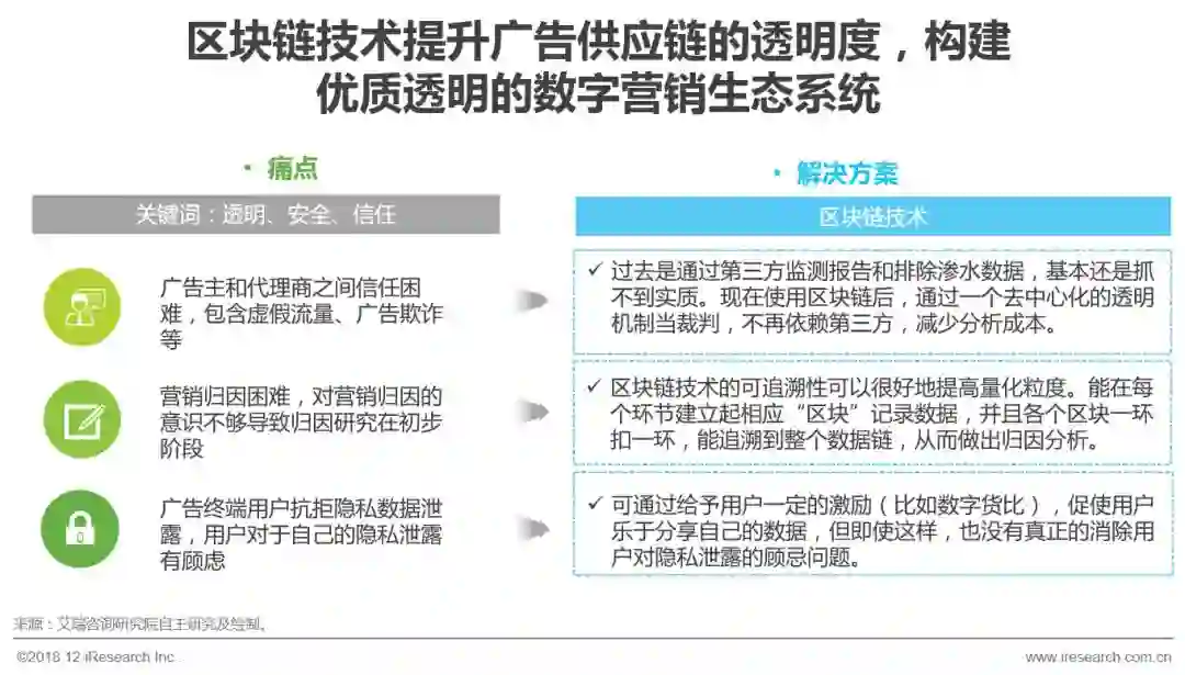 在最初,区块链只被应用到金融领域,后来逐渐应用到医疗领域,而如今,它对于数字营销的价值也逐渐被挖掘出来。在金融领域,区块链是一个不可修改也不可破解的数字分类账,它可以跟踪到每一笔货币的创建和交易,任何人所持有的比特币数量和他们的交易路径都是可见的,同时区块链还防止数据被删除或改写,一旦某份文件被改动,其他文件就会被同步更新,从而保证货币的透明度。区块链技术在营销上的应用价值主要是解决了广告链条当中存在的“透明”、“安全”、“信任”的问题。