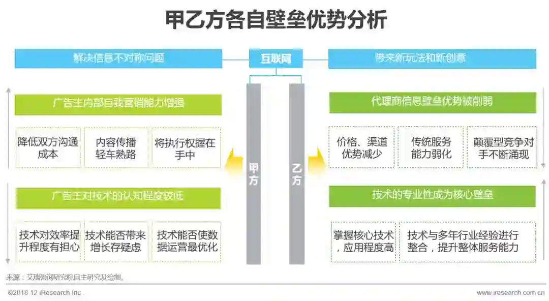对于大多数公司没有实践去乙方的模式,从企业角度去看,一方面受到企业规模限制,人力成本不足以支持公司完成所有的营销传播;一方面是企业所要进行的营销传播更适合代理商去执行,并能保证效果。从代理商角度去看,信息壁垒不再占有优势,技术的专业性成为了他们的新壁垒,而对技术的理解和应用也是广告主目前最为薄弱的地方,因此代理商在产业链中的价值依然很大。