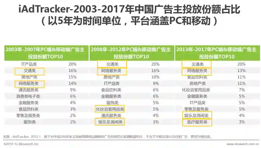 营销行业广告主的投放份额,纵向去看,在2003-2007年间,IT产品类、交通类、房产类占据前三;2008-2012年则是交通类、网络服务类、房地产类;2013-2017年的是交通类、网络服务类、食品饮料类;横向去看,2003-2017年的15年里,交通类广告主的投放热情一直较高,这主要得益于中国汽车行业的蓬勃发展。与交通类广告主情况相似的还有网络服务类,从互联网在中国全面发展以来,其投放预算一直比较稳定,并在持续高涨。同时,在2008年-2017年十年间,化妆浴室用品类和娱乐及消闲类的份额有所提升,这与国家宏观经济发展良好、人民的消费水平升高息息相关。最后,值得一提的是,医疗服务类广告主在近几年比例不断增高,这意味着传统行业广告主也在逐渐开始认可网络广告,移动营销也在逐渐渗透到各行各业中,并起到重要的连接作用。