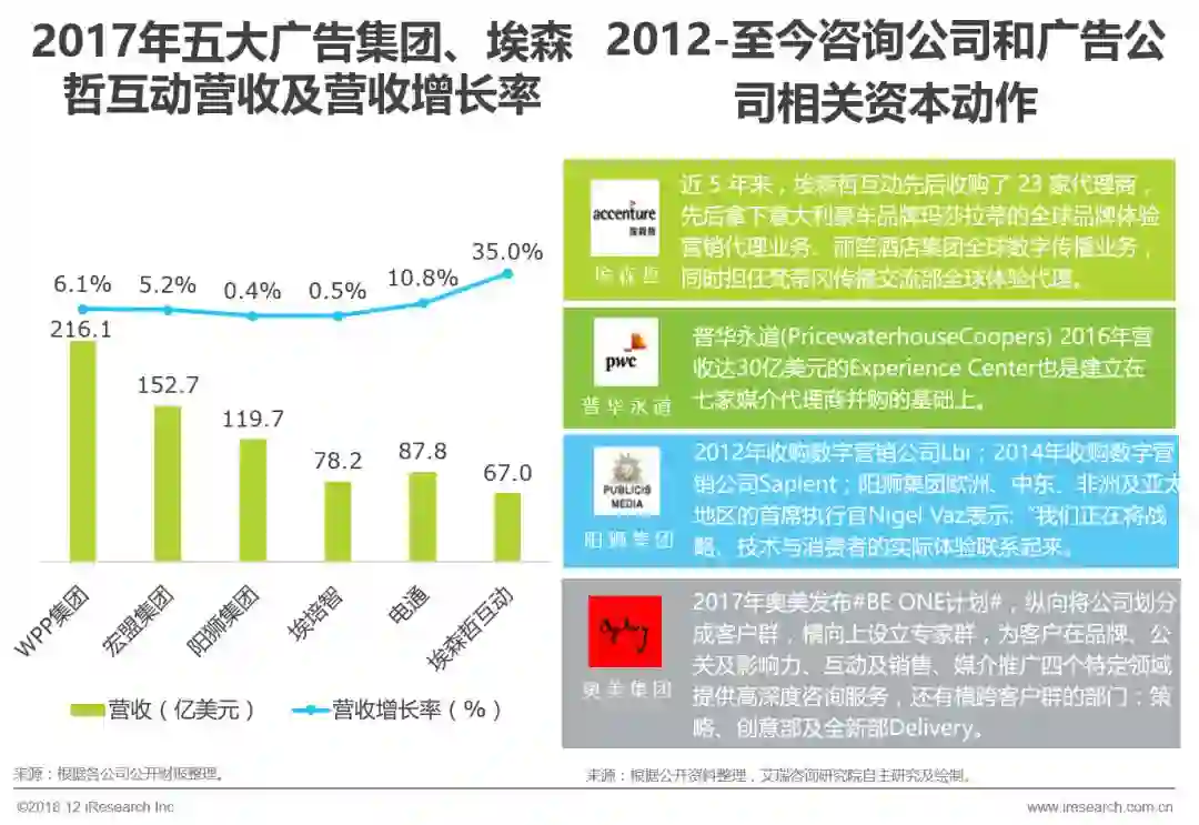 媒介采买中透明度的缺乏以及广告主和媒介代理机构之间的信任问题,给咨询公司提供了机会。同时,在当下的市场阶段,广告主对策略服务的诉求在变高,迫切的希望通过营销策略的调整来帮助他们解决营销问题和撬动增长。然而,和大型传播集团相比,咨询公司在策略的指导服务上更胜一筹,因此在当前市场阶段占据有利地位。从全球视角看,以埃森哲互动为例,据埃森哲互动公开信息显示,2017年埃森哲互动全年营业收入是67亿美元,全年增长率是35%,比五大广告集团中增长最快的电通高出24.2%。