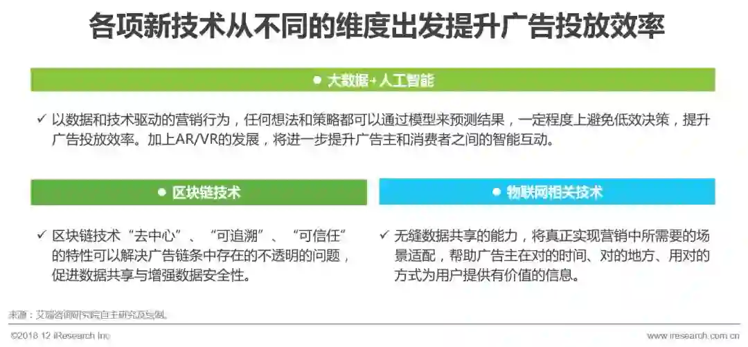 广告技术化时代正在到来,加速企业营销升级:从本质上讲,营销正在经历一场技术革命,移动互联网时代的营销是以互联网技术为基础来实现个性化生产和传播。未来,大数据+人工智能、区块链、物联网对于营销的战略性意义最大,将全面提升投放效率,使营销生态系统更加优质透明。