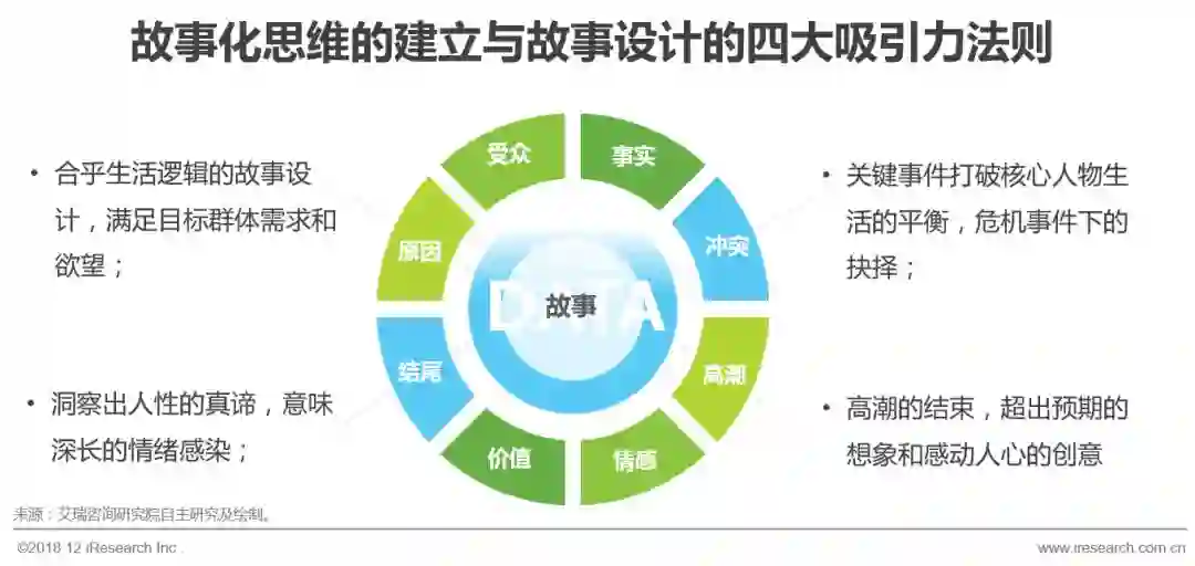 所有的商业战略目标都是为了打动人心,而故事是最能打动人心的一种手段。人类对故事的情有独钟,需要追溯到七万年前人类从动物里面的脱颖而出的原因,是因为语言的诞生,然后是八卦进而衍生出的一个一个小故事,人类一直喜欢故事,是故事让人类的生活充满了意义。到了大数据时代,高密度的数据信息诞生,依然可以借助故事对人类天然的吸引力,建立一套故事化思维。相比于故事,数据仅仅罗列发生的事件,用数据和相关指标解释事实,故事却能将事实的前因后果有效的串起来,将事件链接一段一段的因果关系。《故事经济学》中的作者这样形容故事的力量:故事摒除无关之事,专注于动态变化,随后将它重新构架,将事件链接成一段时间内的一系列因果,故事是终极“信息技术”,顾名思义,讲故事需要“信息”,即对人性、人性与社会现实、人性与真实世界之间的关系进行广阔而深入的了解。