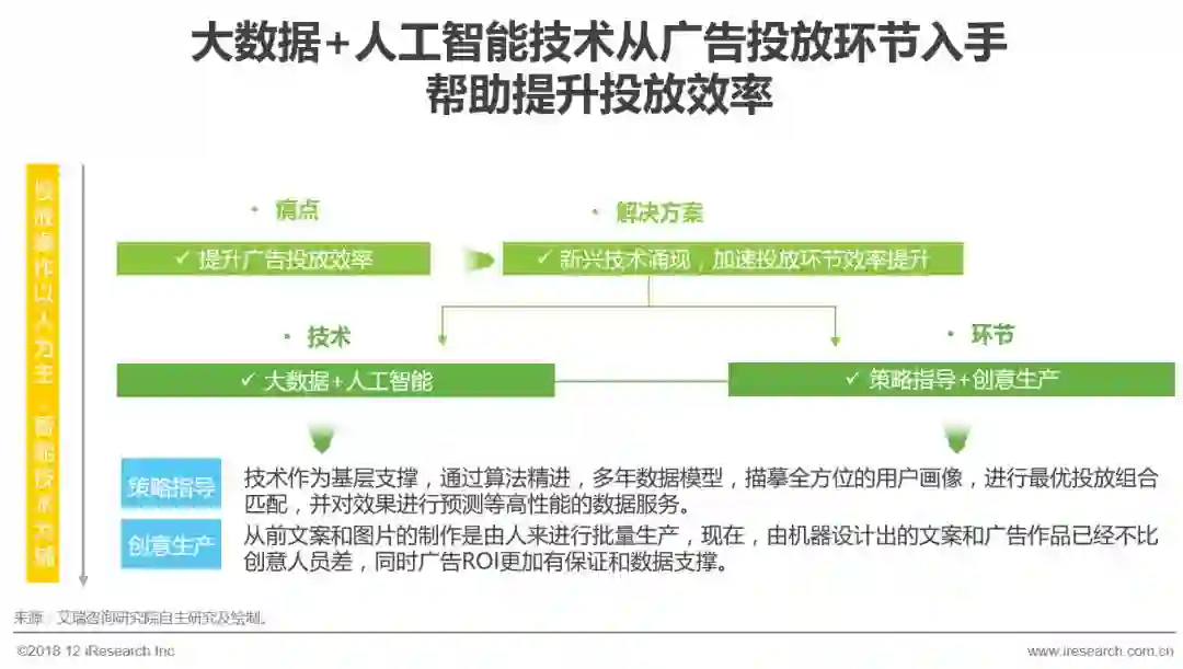 广告主今天所面临的困境和痛点归根结底在于增长乏力,伴随而来的是,提升广告投放效率成了广告主驱动增长的首选方案。大数据+人工智能的发展,在营销投放环节当中起到了提升广告投放效率的作用,使营销更精准。概括出两个重要、效率得到明显提升的环节是策略指导和创意生产。