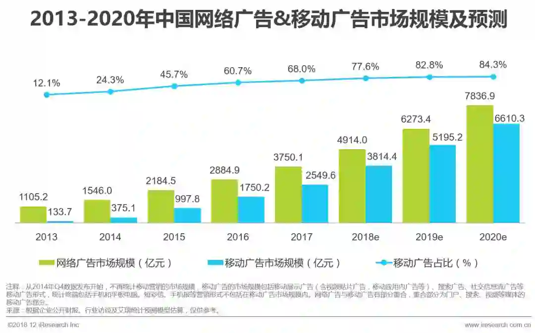移动终端早已成为我们生活的一部分,全生态全功能的打通为移动营销提供了更多价值场景,与此同时,移动广告产业链不断完善,推动着移动广告规模的快速增长。2017年移动广告规模达2549.6亿,占总体网络广告比例近70%,预计2018年,移动广告规模会达到3814.4亿,占总体网络广告的比例接近80%,同时,2020年预计这一比例将达到84.3%,将持续引领网络广告市场发展。