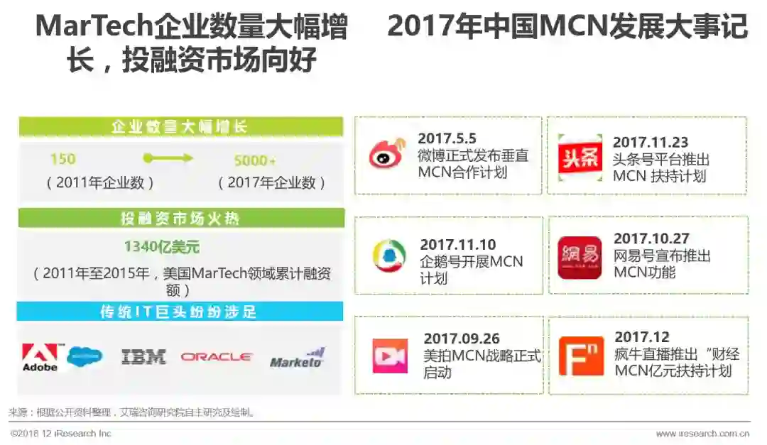 在流量已经被2C的互联网巨头垄断的当下,2B的解决方案提供商将会有很大的机会,企业在数字转型过程中实现快速增长的同时,在流量、内容、数据、运营等方面依然存在短板,现在最为流行的是AdTech和MarTech,两者的职能已经趋于融合,共同为企业提供以用户为中心的生产、销售和客户服务能力;除此之外,通过对所有渠道获得最完整的顾客观察,众多内容生产方遭遇发展瓶颈,无法形成稳定的商业模式,以MCN为代表的专业服务机构应运而生,他们的作用在于帮助PGC开展内容分发、供应管理、营销广告、招募培训等综合业务,通过多方协作,最大化发挥内容的商业价值。