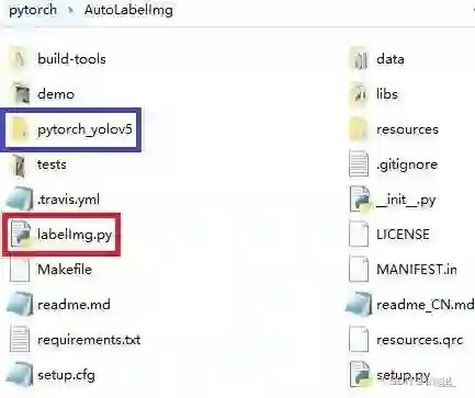 如上所示,最重要的文件包有两个,一个为pytorch_yolov5,(蓝框),一个为labelImg.py(红框),一个是后续需要配置的文件包,一个是主函数文件。