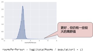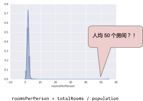 下面的曲线图表示的是加利福尼亚州住房数据集中称为 roomsPerPerson 的特征。roomsPerPerson 值的计算方法是相应地区的房间总数除以相应地区的人口总数。该曲线图显示,在加利福尼亚州的绝大部分地区,人均房间数为 1 到 2 间。不过,请看一下 x 轴。