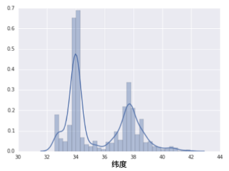 下面的曲线图显示了加利福尼亚州不同纬度的房屋相对普及率。注意集群 - 洛杉矶大致在纬度 34 处,旧金山大致在纬度 38 处。