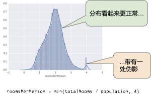 对数缩放可稍稍缓解这种影响,但仍然存在离群值这个大尾巴。我们来采用另一种方法。如果我们只是简单地将 roomsPerPerson 的最大值“限制”为某个任意值(比如 4.0),会发生什么情况呢?