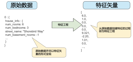 图 1 左侧表示来自输入数据源的原始数据,右侧表示特征矢量,也就是组成数据集中样本的浮点值集。特征工程指的是将原始数据转换为特征矢量。进行特征工程预计需要大量时间。