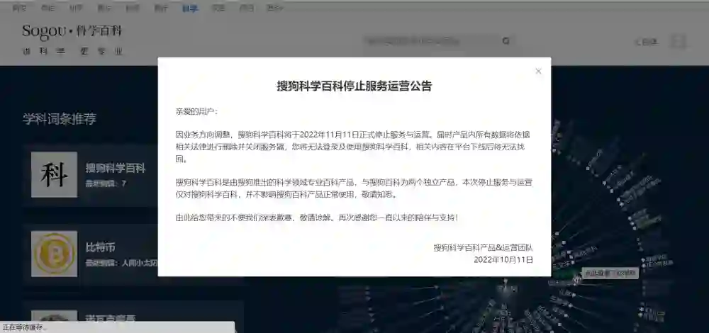 【搜狗科学百科即将停止服务运营】搜狗科学百科近日发布停止服务运营公告称,因业务方向调整,搜狗科学百科将于2022年11月11日正式停止服务与运营。公告指出,搜狗科学百科与搜狗百科为两个独立产品,本次停止服务与运营仅对搜狗科学百科,并不影响搜狗百科产品正常使用。(新浪科技)