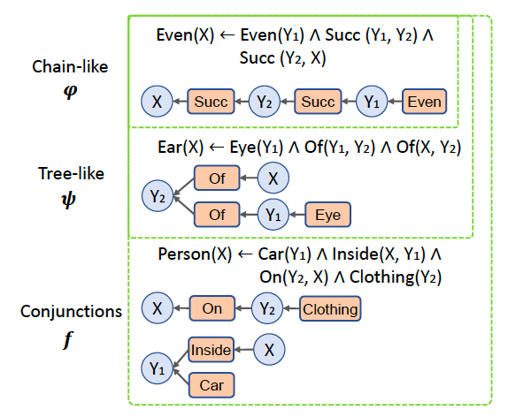 一种应用广泛的推理框架称为归纳逻辑推理程序(Inductive Logic Programming, ILP),它通过规则的硬匹配以及遍历的搜索流程去逐步搜索出满足条件的逻辑范式,但是效率太低,表达能力差,而且对噪音数据的容忍性小。后来一些工作提出了可微分的 ILP 模型,去利用神经网络的学习能力自主的去学到一些泛化性较强的逻辑范式,但是大多模型只能学出一阶逻辑谓词的线性组合范式,表达能力也十分有限,而且基于具体的数据,导致泛化性能不理想。