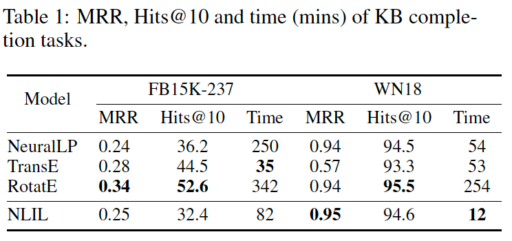 在实验设置上,本文首先以知识图谱补全任务为背景,在三个知识图谱(ES,FB15K-237 以及 WN18)上对 NLIL 模型的效果和效率都做了细致的评估: