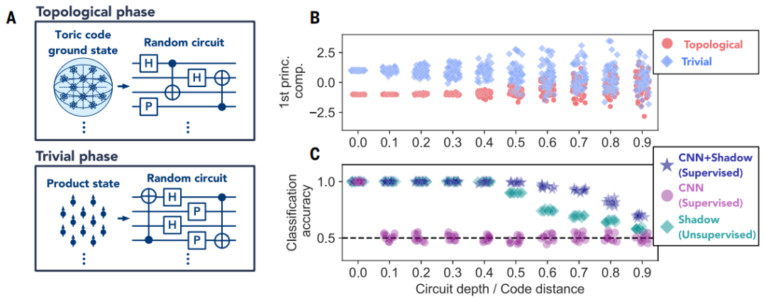 在使用类似证明技术的相关贡献中,该团队展示了经典 ML 算法可以有效地学习如何对物质的量子相进行分类。在这种情况下,训练数据由量子状态的经典表示组成,其中每个状态都带有一个标签,表明它属于 A 相还是 B 相。然后,ML 算法预测训练期间未遇到的量子态的相位标签。经典的 ML 算法不仅对相位进行准确分类,而且构造了显式的分类函数。数值实验验证了他们提出的机器学习算法在各种场景中都能很好地工作,包括里德堡原子系统、二维随机海森堡模型、对称保护拓扑相和拓扑有序相。