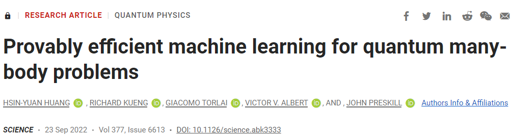 该研究以「Provably efficient machine learning for quantum many-body problems」为题,于 2022 年 9 月 23 日发布在《Science》。