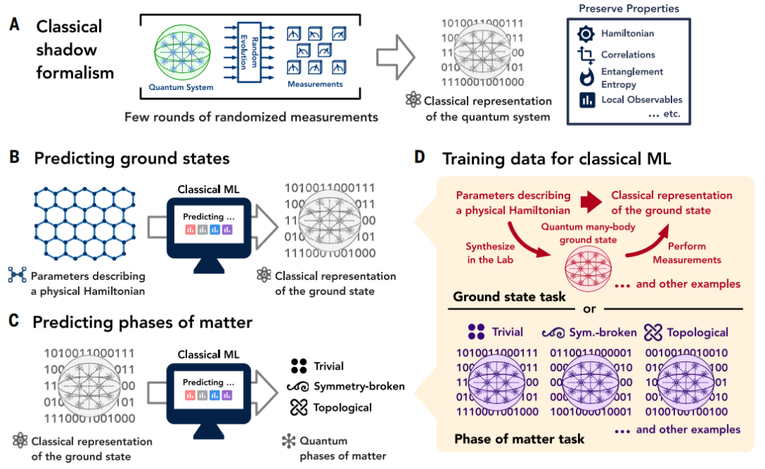 研究人员已经严格确定,经典的机器学习算法,根据物理实验中收集的数据,可以有效地解决一些量子多体问题。这些严谨的结果提高了科学家的希望,即在实验数据上训练的经典 ML 可以解决化学和材料科学中的实际问题,这些问题仅使用经典处理很难解决。该团队的论点建立在从随机泡利测量得出的量子态的简洁经典表示的概念之上。尽管一些量子设备缺乏执行此类测量所需的局部控制,但他们希望经典 ML 可以利用其他经典表示并获得类似的强大结果。如何利用可访问的测量数据来可靠地预测属性?回答这些问题将扩大近期量子平台的范围。