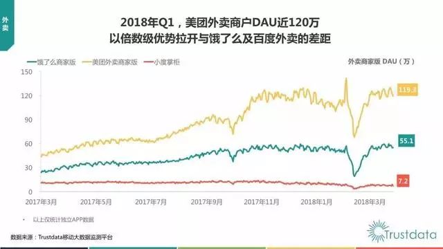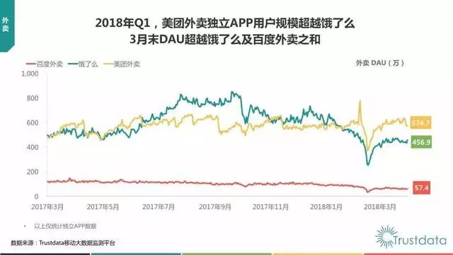 报告显示,2018年第一季度,美团外卖独立APP用户规模持续领先于饿了么、百度外卖等竞争对手。截至3月末,美团外卖DAU(日活跃用户数量)达到574.7万,饿了么DAU为456.9万,百度外卖DAU为54.7万,美团外卖日活跃用户数量已经超越饿了么与百度外卖之和。