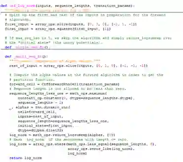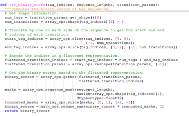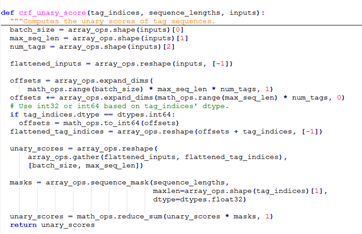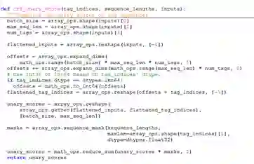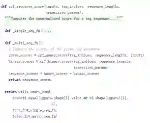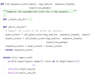 crf_sequence_score通过crf_unary_score计算状态特征分数,通过crf_binary_score计算共现特征分数。