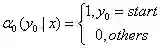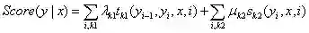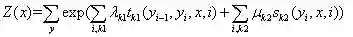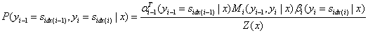 状态序列y,位置i-1,i的取值为特定值,其余位置为任意值的可能性分数的归一化条件概率:
