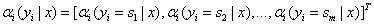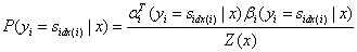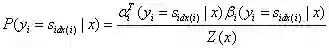 状态序列y,位置i的取值为特定值,其余位置为任意值的可能性分数的归一化条件概率: