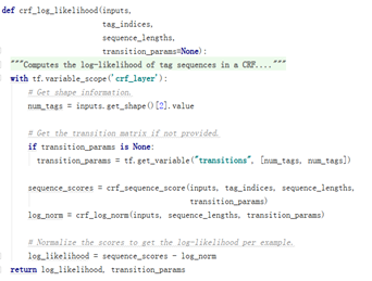 CRF模块通过crf_sequence_score计算状态序列可能性分数,通过crf_log_norm计算归一化项。