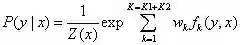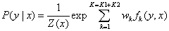 例:输入观测序列为X=(x1,x2,x3),输出状态序列为Y=(y1,y2,y3),状态值集合为{1,2}。在已知观测序列后,得到的特征函数如下。求状态序列为Y=(y1,y2,y3)=(1,2,2)的非规范化条件概率。