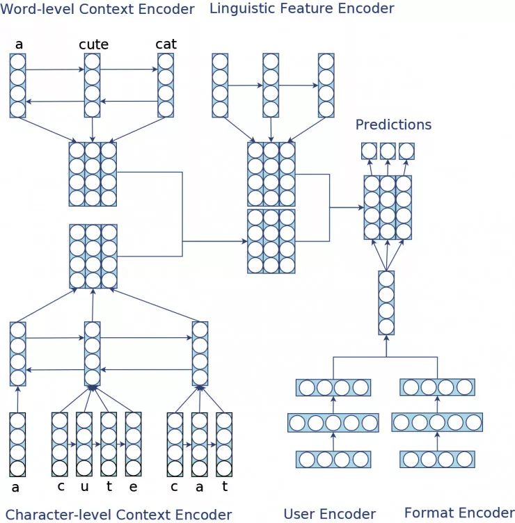 语境编码器用来编码句子的语言环境,它由一个字母级别的编码器与一个单词级别的编码器构成。字母级别编码器是一个层级式的循环神经网络结构,单词级别编码器则是一个双向长短期记忆神经网络 LSTM;语言学特征编码器也是一个 LSTM 结构,主要用于编码提取的语言学特征,为语境编码器提供额外的信息;用户编码器是一个全连接的结构,用于记录用户的第二语言能力与学习历史;题型编码器则是用来编码题型、答题方式等信息。