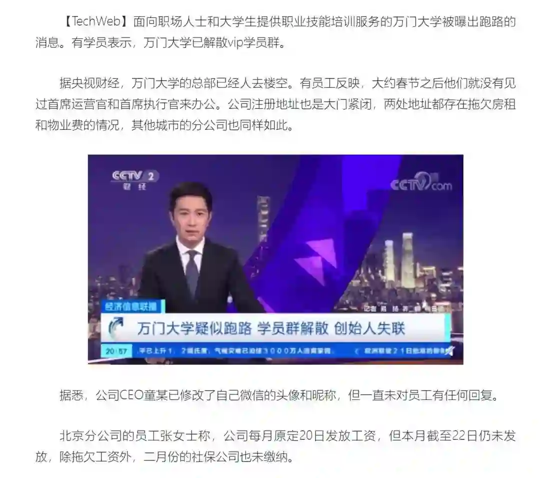 3月22日,有“中国第一所网络大学”之称的万门大学被曝出携款跑路。VIP学员群相继解散,万门大学的总部早已人去楼空,只留下了拖欠的物业费和被骗的学员。
