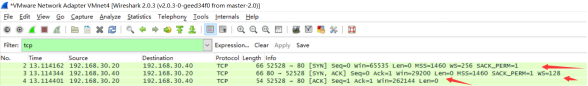 接下来”第二次握手”服务器返回的TCP报文中以[SYN,ACK]作为标志位;并且服务器端序号Seq=0;确认号Ack=1(“第一次握手”中客户端序号Seq的值+1);