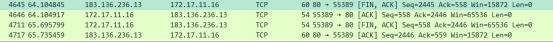 ”第三次挥手”服务器端继续返回的FIN同意释放连接报文以[FIN,ACK]作为标志位;其中报文序号Seq=558;确认号Ack=2246;