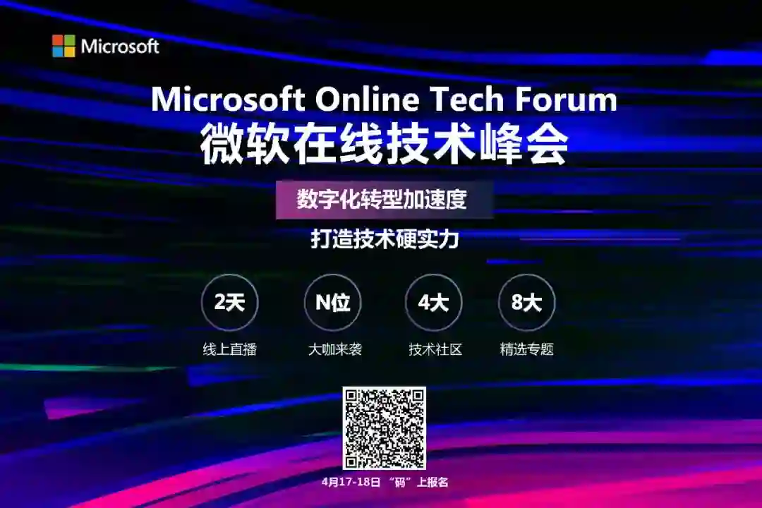 4 月 17-18 日,首届 Microsoft Online Tech Forum 微软在线技术峰会将在线上正式拉开帷幕!!!此次会上,微软将会围绕“数字化转型加速度”为主题,以微软自身技术产品和行业实践为引,通过在技术层面持续推陈出新,以站在行业数字生态的视角全面分享微软在云、生产力、商业应用以及实践落地这 4 大数字化场景下的技术创新与行业洞察,以期能够加速行业内的数字化进程,引领业界未来数字生态的趋势走向。