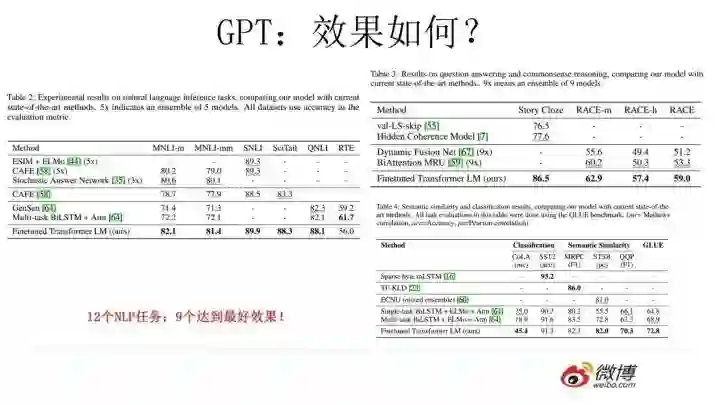 GPT的效果是非常令人惊艳的,在12个任务里,9个达到了最好的效果,有些任务性能提升非常明显。