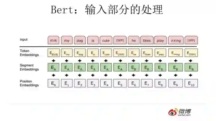 顺带讲解下Bert的输入部分,也算是有些特色。它的输入部分是个线性序列,两个句子通过分隔符分割,最前面和最后增加两个标识符号。每个单词有三个embedding:位置信息embedding,这是因为NLP中单词顺序是很重要的特征,需要在这里对位置信息进行编码;单词embedding,这个就是我们之前一直提到的单词embedding;第三个是句子embedding,因为前面提到训练数据都是由两个句子构成的,那么每个句子有个句子整体的embedding项对应给每个单词。把单词对应的三个embedding叠加,就形成了Bert的输入。
