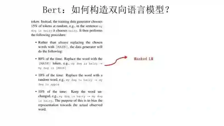 Masked双向语言模型向上图展示这么做:随机选择语料中15%的单词,把它抠掉,也就是用[Mask]掩码代替原始单词,然后要求模型去正确预测被抠掉的单词。但是这里有个问题:训练过程大量看到[mask]标记,但是真正后面用的时候是不会有这个标记的,这会引导模型认为输出是针对[mask]这个标记的,但是实际使用又见不到这个标记,这自然会有问题。为了避免这个问题,Bert改造了一下,15%的被上天选中要执行[mask]替身这项光荣任务的单词中,只有80%真正被替换成[mask]标记,10%被狸猫换太子随机替换成另外一个单词,10%情况这个单词还待在原地不做改动。这就是Masked双向语音模型的具体做法。