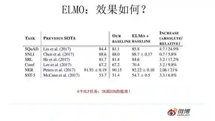 ELMO经过这般操作,效果如何呢?实验效果见上图,6个NLP任务中性能都有幅度不同的提升,最高的提升达到25%左右,而且这6个任务的覆盖范围比较广,包含句子语义关系判断,分类任务,阅读理解等多个领域,这说明其适用范围是非常广的,普适性强,这是一个非常好的优点。
