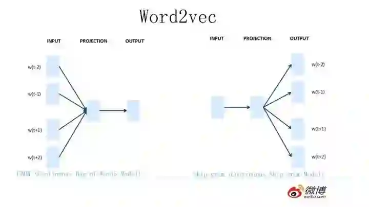 Word2Vec的网络结构其实和NNLM是基本类似的,只是这个图长得清晰度差了点,看上去不像,其实它们是亲兄弟。不过这里需要指出:尽管网络结构相近,而且也是做语言模型任务,但是其训练方法不太一样。Word2Vec有两种训练方法,一种叫CBOW,核心思想是从一个句子里面把一个词抠掉,用这个词的上文和下文去预测被抠掉的这个词;第二种叫做Skip-gram,和CBOW正好反过来,输入某个单词,要求网络预测它的上下文单词。而你回头看看,NNLM是怎么训练的?是输入一个单词的上文,去预测这个单词。这是有显著差异的。为什么Word2Vec这么处理?原因很简单,因为Word2Vec和NNLM不一样,NNLM的主要任务是要学习一个解决语言模型任务的网络结构,语言模型就是要看到上文预测下文,而word embedding只是无心插柳的一个副产品。但是Word2Vec目标不一样,它单纯就是要word embedding的,这是主产品,所以它完全可以随性地这么去训练网络。