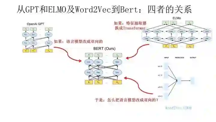 到这里我们可以再梳理下几个模型之间的演进关系。从上图可见,Bert其实和ELMO及GPT存在千丝万缕的关系,比如如果我们把GPT预训练阶段换成双向语言模型,那么就得到了Bert;而如果我们把ELMO的特征抽取器换成Transformer,那么我们也会得到Bert。所以你可以看出:Bert最关键两点,一点是特征抽取器采用Transformer;第二点是预训练的时候采用双向语言模型。