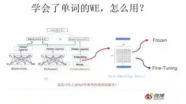 假设如上图所示,我们有个NLP的下游任务,比如QA,就是问答问题,所谓问答问题,指的是给定一个问题X,给定另外一个句子Y,要判断句子Y是否是问题X的正确答案。问答问题假设设计的网络结构如上图所示,这里不展开讲了,懂得自然懂,不懂的也没关系,因为这点对于本文主旨来说不关键,关键是网络如何使用训练好的Word Embedding的。它的使用方法其实和前面讲的NNLM是一样的,句子中每个单词以Onehot形式作为输入,然后乘以学好的Word Embedding矩阵Q,就直接取出单词对应的Word Embedding了。这乍看上去好像是个查表操作,不像是预训练的做法是吧?其实不然,那个Word Embedding矩阵Q其实就是网络Onehot层到embedding层映射的网络参数矩阵。所以你看到了,使用Word Embedding等价于什么?等价于把Onehot层到embedding层的网络用预训练好的参数矩阵Q初始化了。这跟前面讲的图像领域的低层预训练过程其实是一样的,区别无非Word Embedding只能初始化第一层网络参数,再高层的参数就无能为力了。下游NLP任务在使用Word Embedding的时候也类似图像有两种做法,一种是Frozen,就是Word Embedding那层网络参数固定不动;另外一种是Fine-Tuning,就是Word Embedding这层参数使用新的训练集合训练也需要跟着训练过程更新掉。