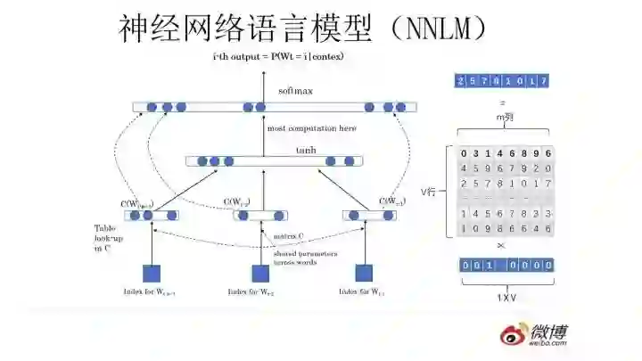 你可以像上图这么设计这个网络结构,这其实就是大名鼎鼎的中文人称“神经网络语言模型”,英文小名NNLM的网络结构,用来做语言模型。这个工作有年头了,是个陈年老工作,是Bengio 在2003年发表在JMLR上的论文。它生于2003,火于2013,以后是否会不朽暂且不知,但是不幸的是出生后应该没有引起太大反响,沉寂十年终于时来运转沉冤得雪,在2013年又被NLP考古工作者从海底湿淋淋地捞出来了祭入神殿。为什么会发生这种技术奇遇记?你要想想2013年是什么年头,是深度学习开始渗透NLP领域的光辉时刻,万里长征第一步,而NNLM可以算是南昌起义第一枪。在深度学习火起来之前,极少有人用神经网络做NLP问题,如果你10年前坚持用神经网络做NLP,估计别人会认为你这人神经有问题。所谓红尘滚滚,谁也挡不住历史发展趋势的车轮,这就是个很好的例子。