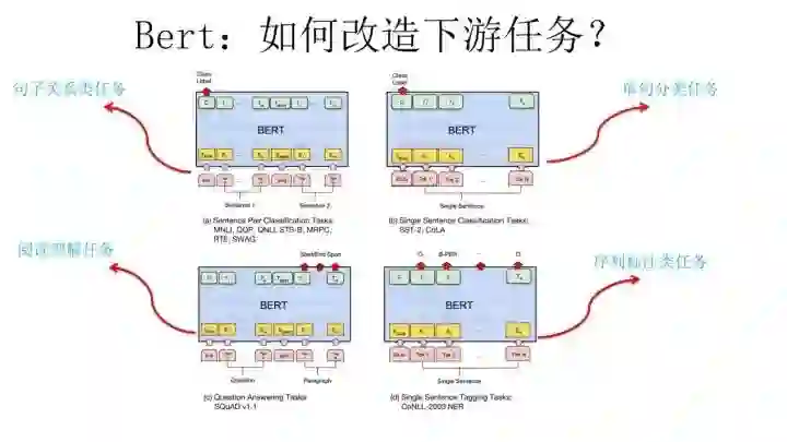 第二阶段,Fine-Tuning阶段,这个阶段的做法和GPT是一样的。当然,它也面临着下游任务网络结构改造的问题,在改造任务方面Bert和GPT有些不同,下面简单介绍一下。