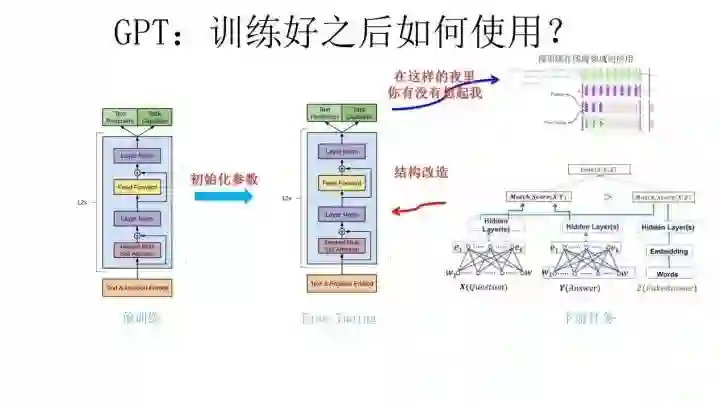 好了,题外话结束,我们再回到主题,接着说GPT。上面讲的是GPT如何进行第一阶段的预训练,那么假设预训练好了网络模型,后面下游任务怎么用?它有自己的个性,和ELMO的方式大有不同。