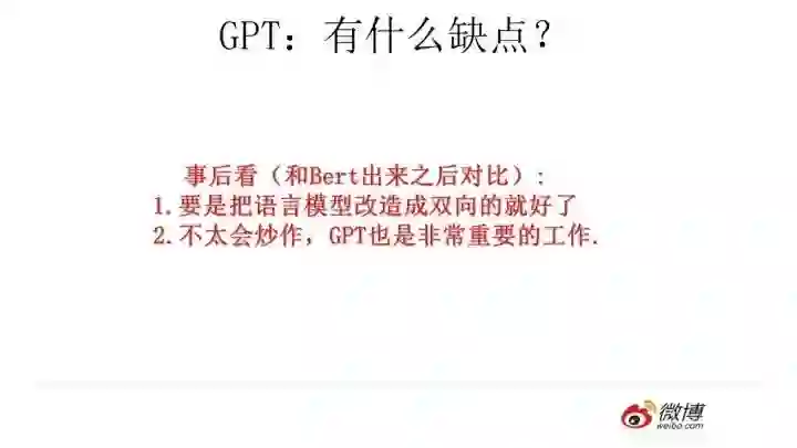 那么站在现在的时间节点看,GPT有什么值得改进的地方呢?其实最主要的就是那个单向语言模型,如果改造成双向的语言模型任务估计也没有Bert太多事了。当然,即使如此GPT也是非常非常好的一个工作,跟Bert比,其作者炒作能力亟待提升。